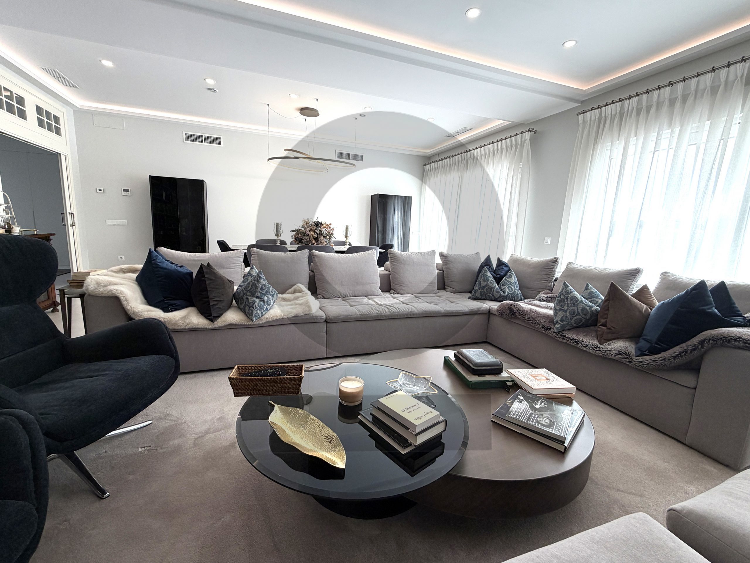 La planta bajo rasante ofrece la sensación, luz y ventilación como si estuviera sobre rasante ya que se realizó un pasillo tipo patio ingles donde desembocan la mayoría de estancias para además dar servicio a la zona de piscina, incluye un gimnasio de 40 m2, trastero, armarios ocultos tras la pared de espejo de lado a lado el mismo para cambios de temporada, sala de cine de 30 m2 y dormitorio extra, garaje con una rampa diseñada para poder maniobrar fácilmente con capacidad para tres coches.