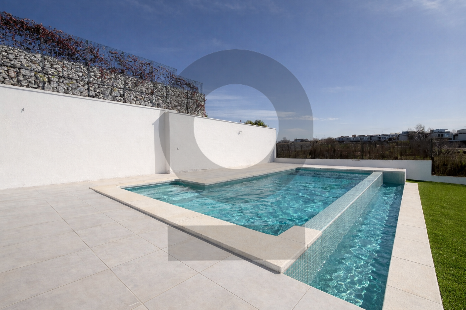 La fachada es de piedra natural, las paredes lisas y la carpintería interior es de madera lacada, aportando elegancia en cada detalle. La cubierta de imagen plana favorece un diseño arquitectónico contemporáneo que se adapta perfectamente al entorno.